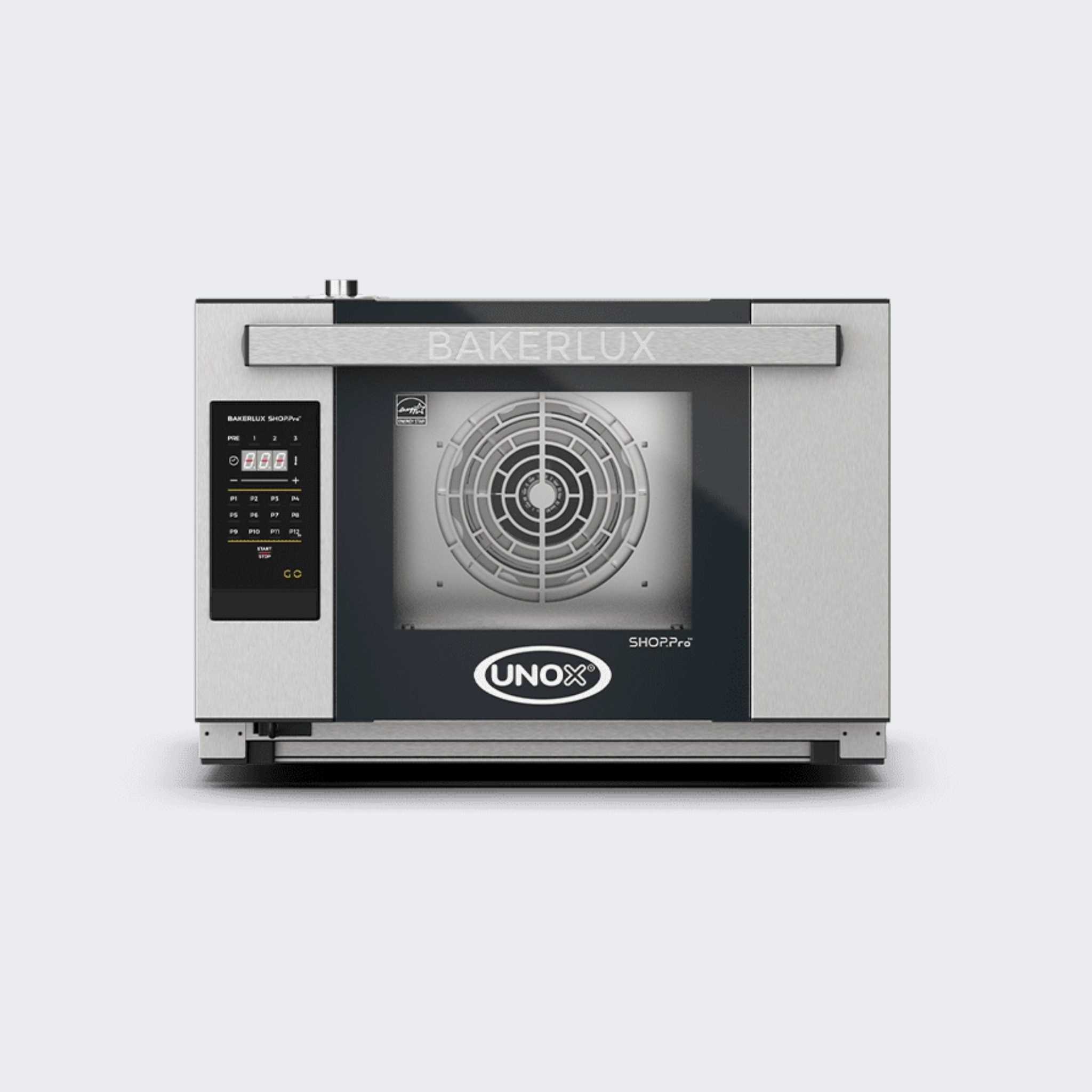 Horno de convección programable y fácil de usar, perfecto para productos de desayuno y aperitivos, en particular de pastelería y panadería congelada. El panel digital permite almacenar 99 programas con 3 pasos de cocción más precalentamiento, 12 de ellos con acceso inmediato. Cámara en acero inoxidable redondeada para facilitar la limpieza y garantizar la máxima higiene.